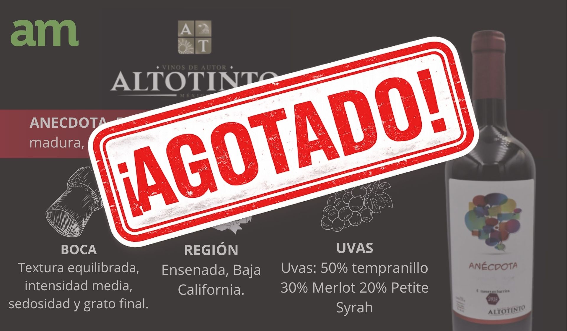 Ensamble de Tempranillo, Merlot y Petite Syrah de Ensenada, región reconocida por su calidad vinícola.